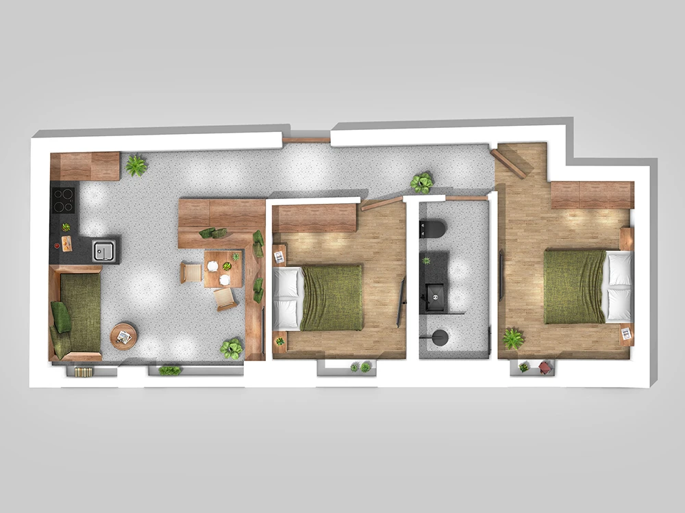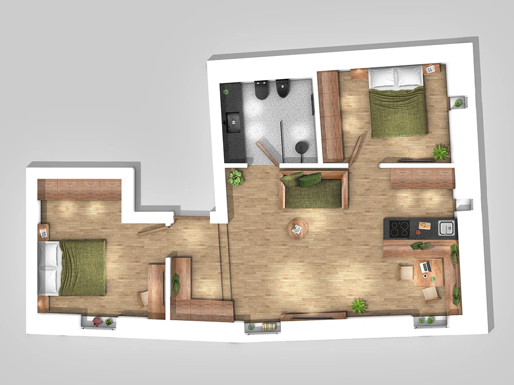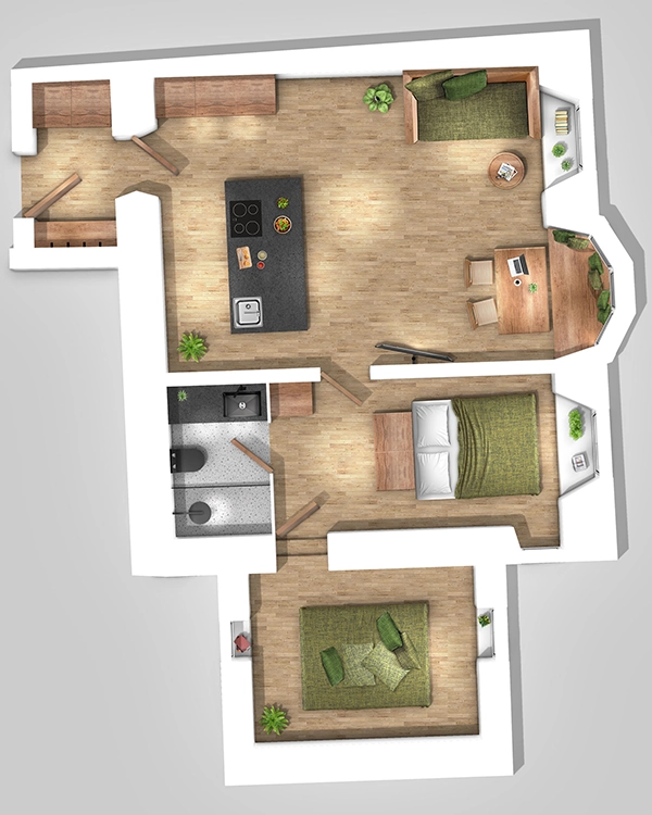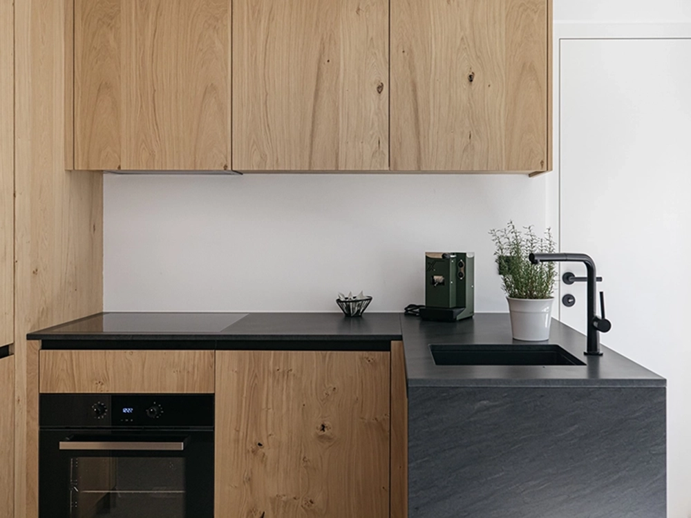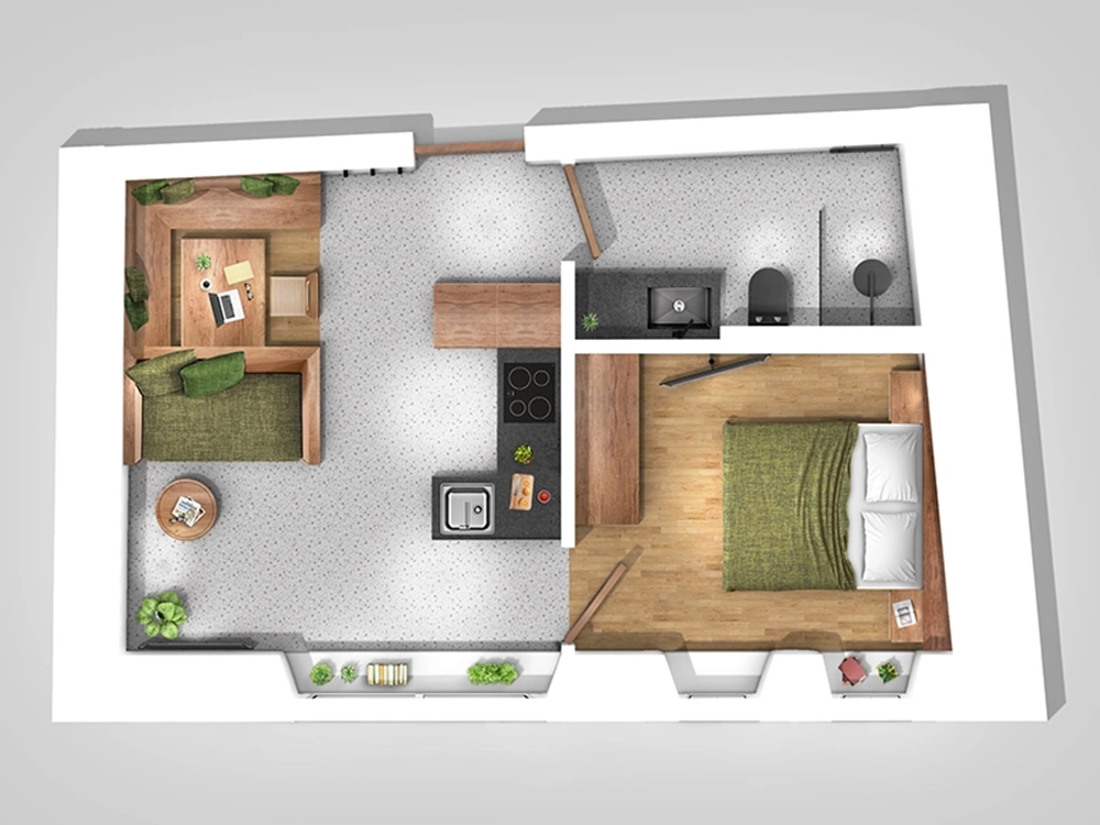 Helles Komfortstudio mit voll ausgestatteter Küche, gemütlicher Wohnecke und hochwertigem Badezimmer mit Dusche. Der Schlafbereich ist durch eine Trennwand separiert. Das Studio liegt an der ruhigen Kapuzinergasse.