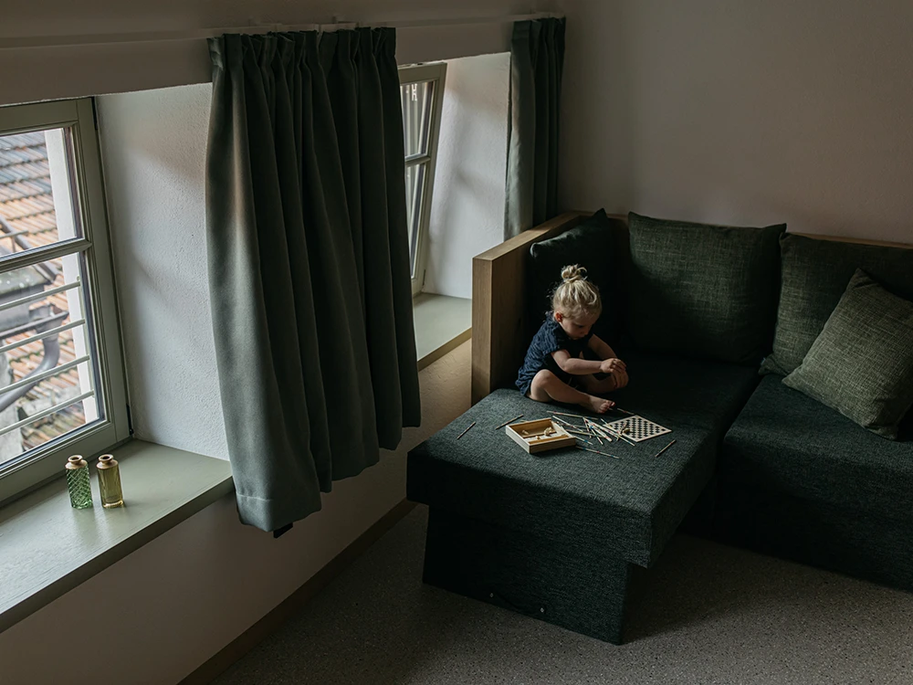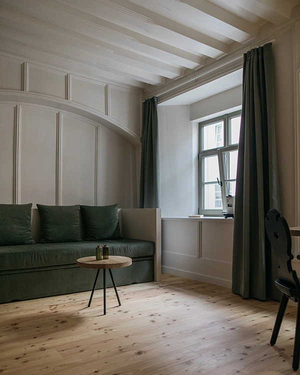 Unsere 10 Apartments befinden sich mitten in der lebendigen Altstadt von Sterzing. Dort, wo einst Ida in ihrem Kurzwarenladen Knöpfe sortierte. Heute verschmelzen hier Vergangenheit, Eleganz und Design zu einem harmonischen Ganzen. Die Gemäuer aus dem 14. Jahrhundert haben sich verwandelt: Die gotischen Stuben mit ihren Sternrippengewölben und kunstvoll verzierten Gebälken wurden behutsam modernisiert; große Fenster lassen viel Tageslicht herein und schaffen eine gemütliche Atmosphäre. Willkommen zu einer besonderen Auszeit – um zu entspannen oder Stadt und Natur zu entdecken.