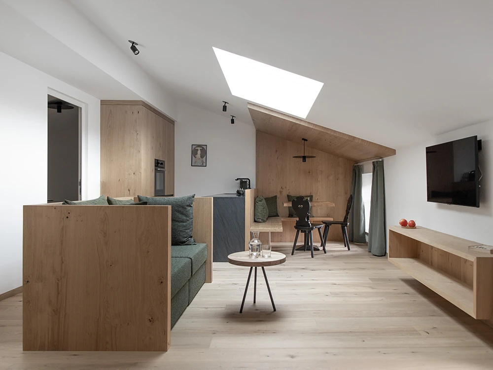Apartment im Dachgeschoss zur Stadtseite mit hellen Panorama-Dachluken. Zwei getrennte Schlafzimmer, großes hochwertiges Badezimmer mit Dusche, voll ausgestattete Küche, gemütliche Doppel-Schlafcouch im Wohnraum, Tiroler Stubenecke mit Blick auf die historische Neustadt.